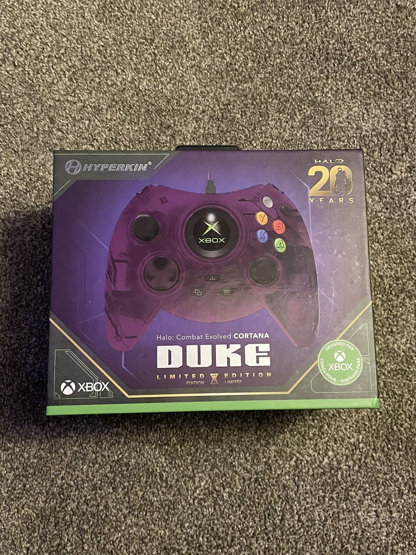 Halo combat evolved CORTANA duke limited edition xbox controller DOES NOT COME WITH CORD!! any type C would work! not sure if it works and not sure how to turn it on! collectible!!! never used screen and the controller it’s self does kinda light up but then shuts off