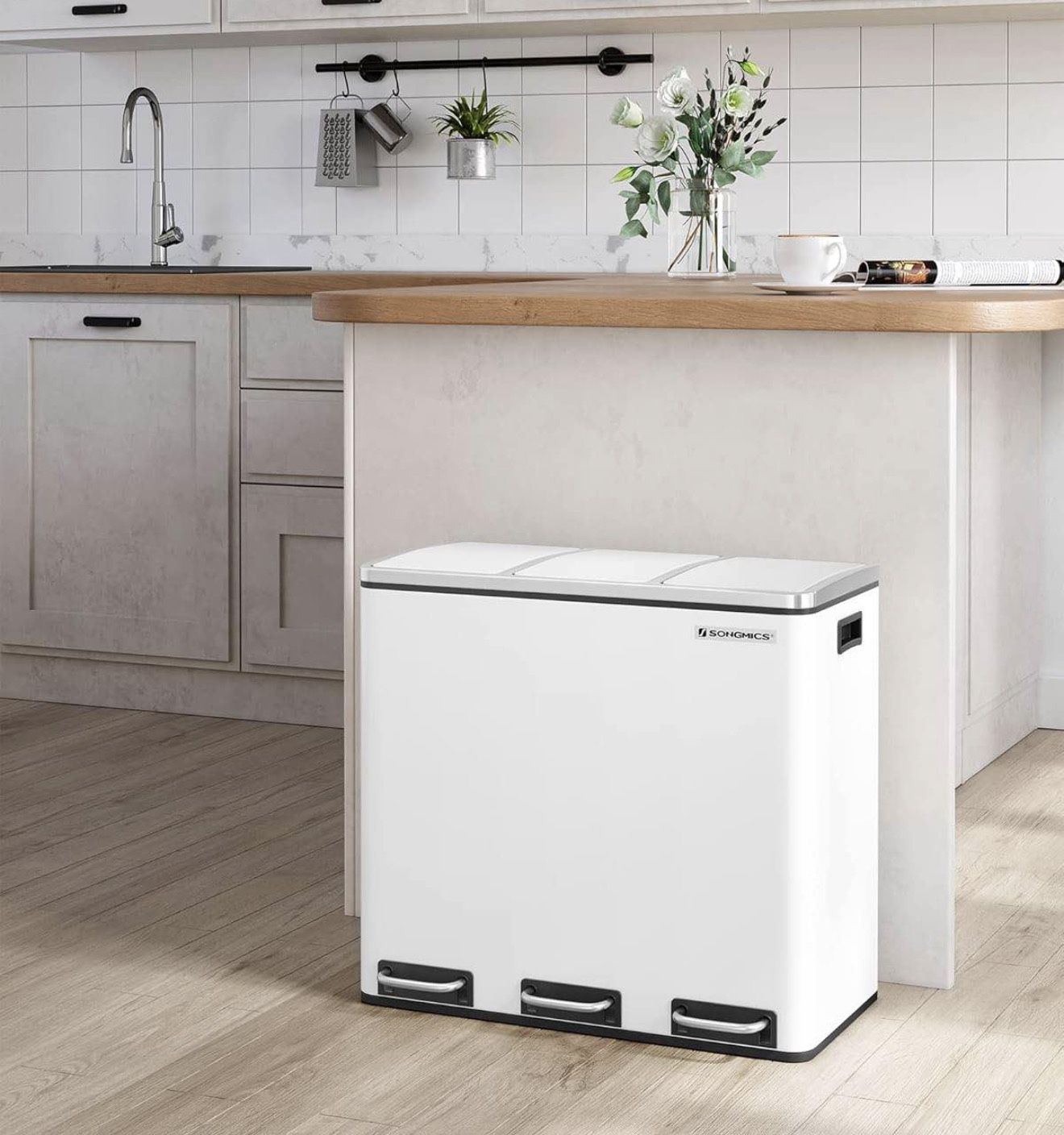 New in box Trash Can, 3 x 4.8 Gallon Garbage Can, 14.4 Gallon Recycle Bin with Soft-Close Lids, Pedals, and Inner Buckets for Kitchen, Stainless Steel, White ULTB154W01