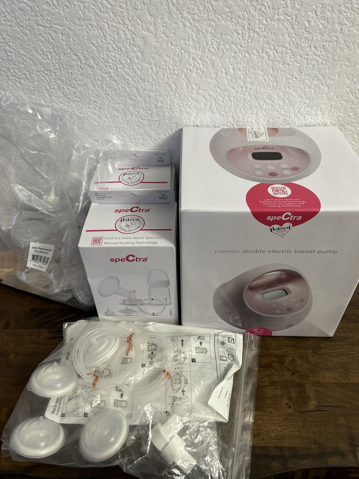 New electric breast pump Spectra S2 Plus with 4 sets of replacement parts.