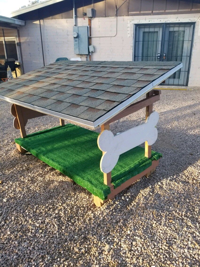 Fits 2 full size German shepherds in it comfortable at once …. Has a real shingled roof …. Artificial grass sits about 4 inches off the ground ….. 75.00 firm