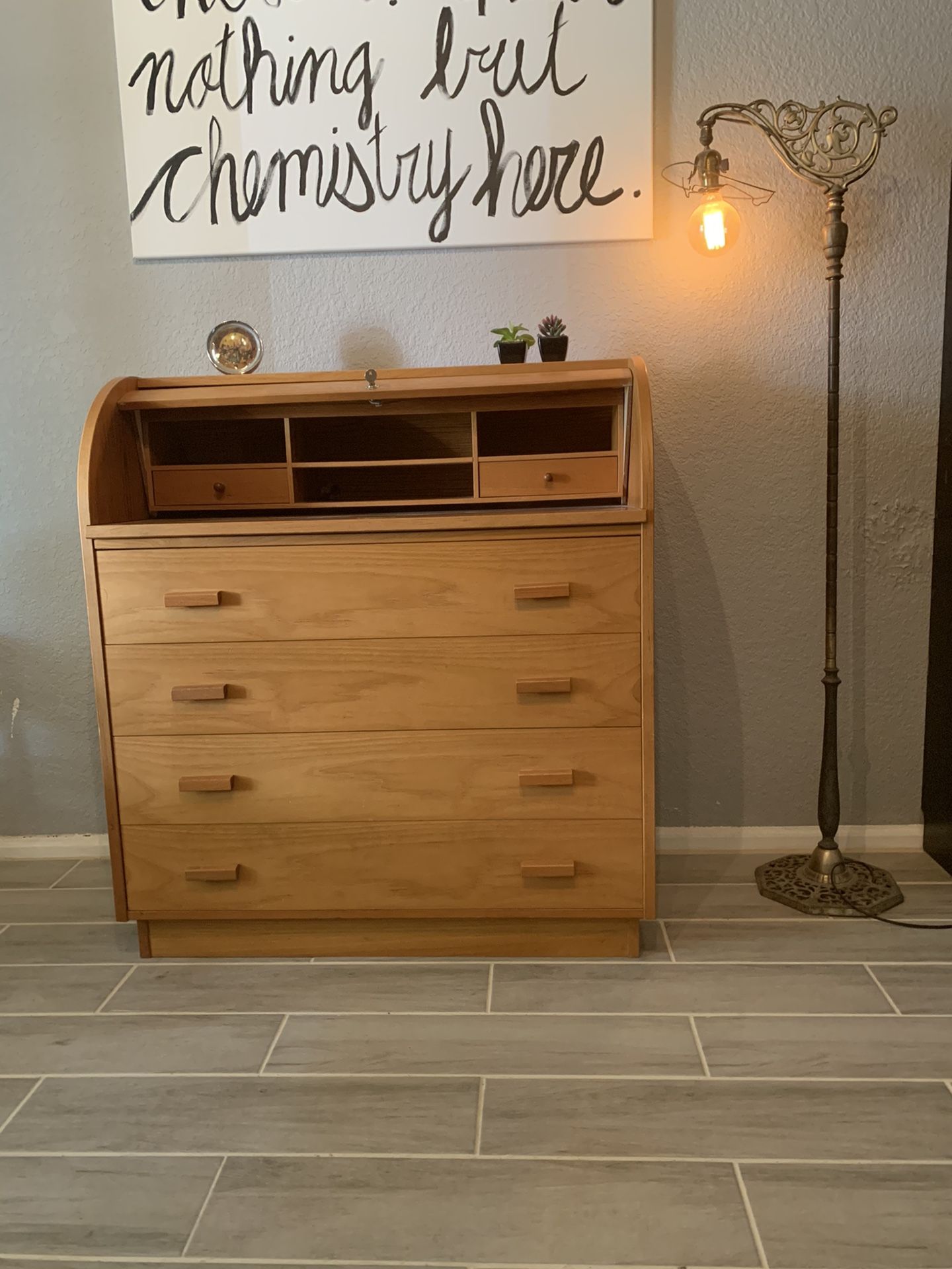 39” high 35 1/2” long 18” wide I have the key to lock the top. Would look cute in a hallway/entry way, bedroom or an office. Pick up only.