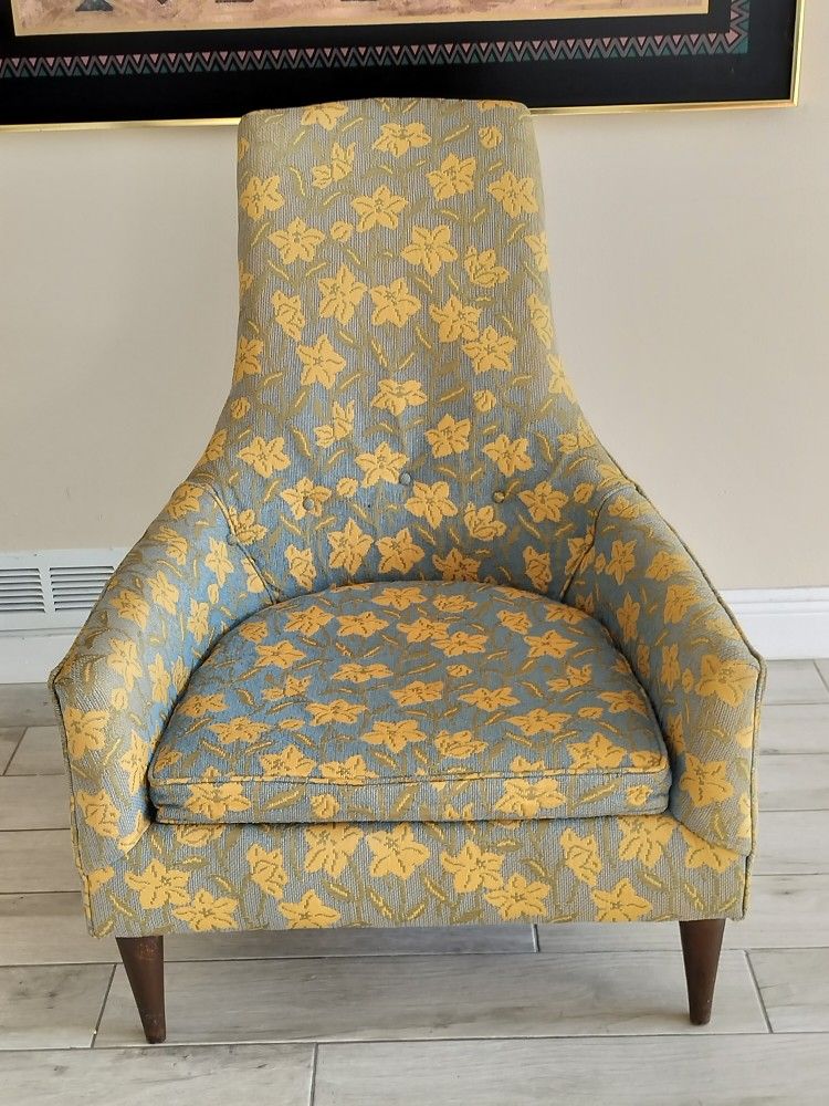 Vintage Mid Century High-Back Lounge Chair is often associated with designers like Adrian Pearsall or Edward Wormley due to its distinctive swooping lines and tall, narrow backrest. The chair features a tapered silhouette and sits on splayed walnut legs, which are hallmark traits of the period. Era 1950/60. Minimal Wear....some fading on upholstery. Buttons intact. Foam could be replaced but not needed. While similar chairs can be found through vintage retailers, they are often one-of-a-kind restorations. 39.5H x 30W Arm to Arm x 16H Floor to Seat x 21D.