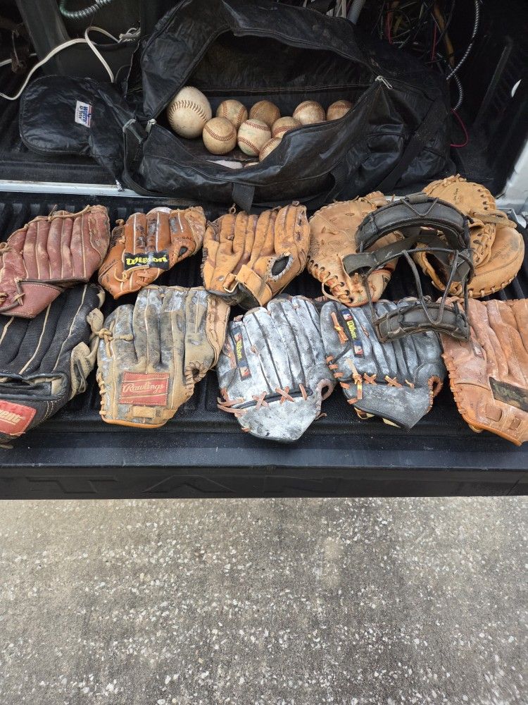 10 Baseball gloves 2 are catchers mate with face mask and 13 balls