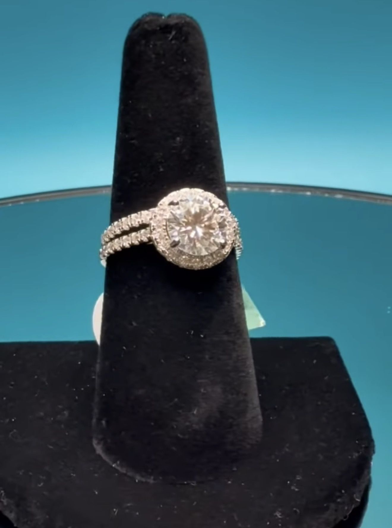 This exquisite wedding set features a round center halo design with a pave-set band that sparkles from every angle. The matching band fits seamlessly against the engagement ring, creating a timeless and elegant look. Details: • Metal: 925 Sterling Silver • Stones: Premium D Color, VVS1 Moissanite • Total Carat Weight: 3.3 CT • All stones passes the diamond tester • Includes black velvet ring box Crafted to capture the brilliance of natural diamonds, this moissanite set offers luxury and lasting beauty without the high price tag. Perfect for engagements, weddings, or as a stunning anniversary gift. Original Price: $600 Sale Price: $500 Size: 7