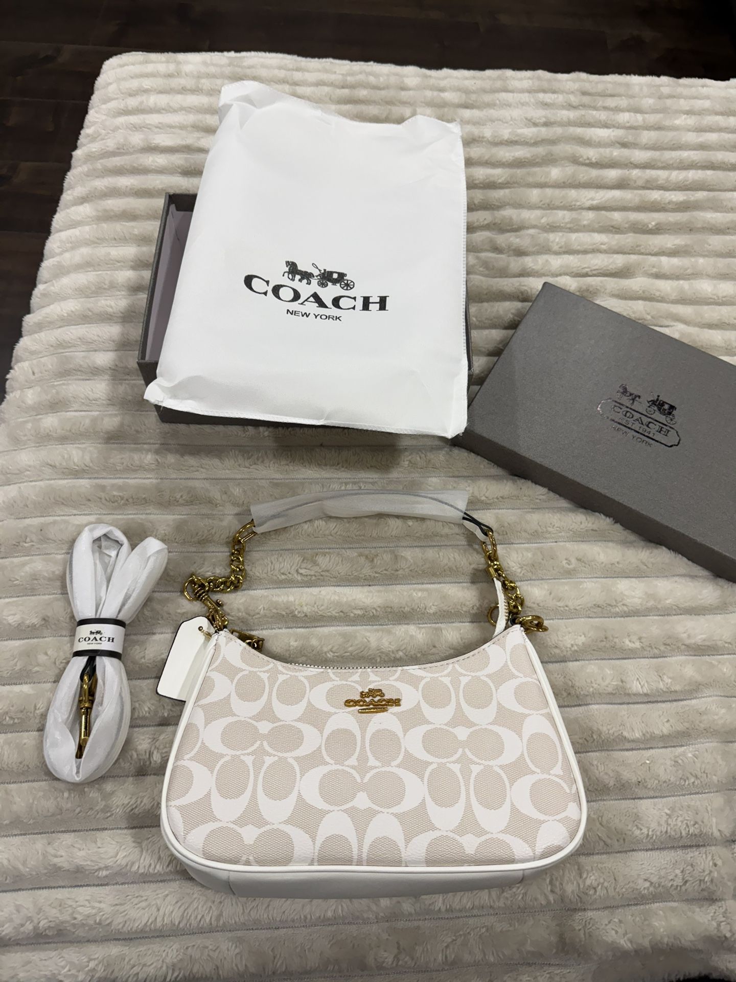 Authentic Coach Teri shoulder bag in classic white Signature canvas. Features smooth leather trim, zip-top closure, and polished hardware. Compact yet roomy enough for daily essentials. Clean, stylish, and versatile—perfect for everyday wear or special outings. • Color: White Signature Canvas • Style: Teri Shoulder Bag • Condition: Gently used / excellent condition • Zip closure • Comfortable shoulder strap • 100% authentic Coach Great timeless piece that pairs with any outfit. Ships fast and safely.
