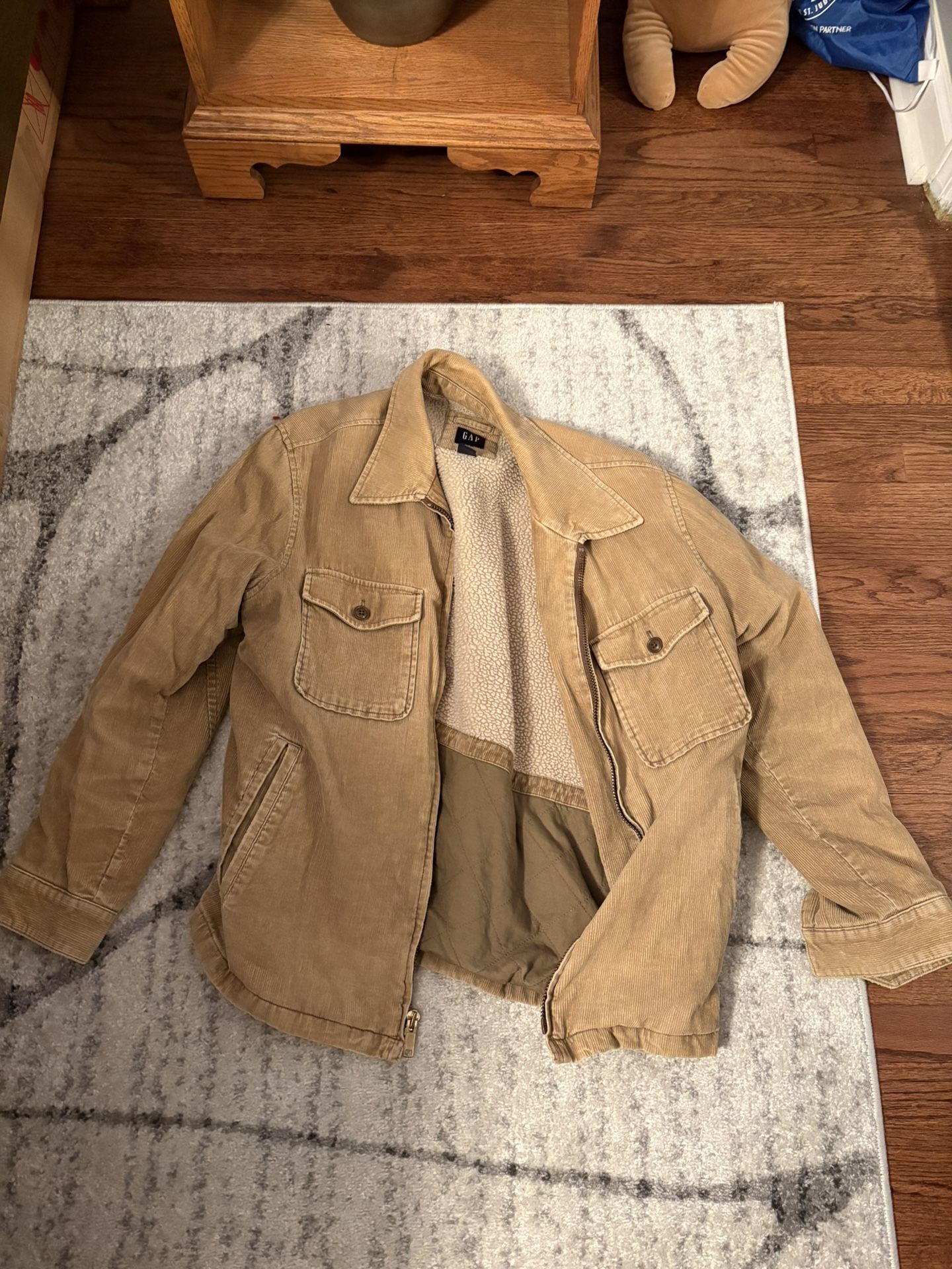 GAP men's corduroy jacket. Features dual chest pockets and a rugged look. Ideal for casual wear. Size L. Tear in pockets on inside, not visible from outside and does not affect functionality.