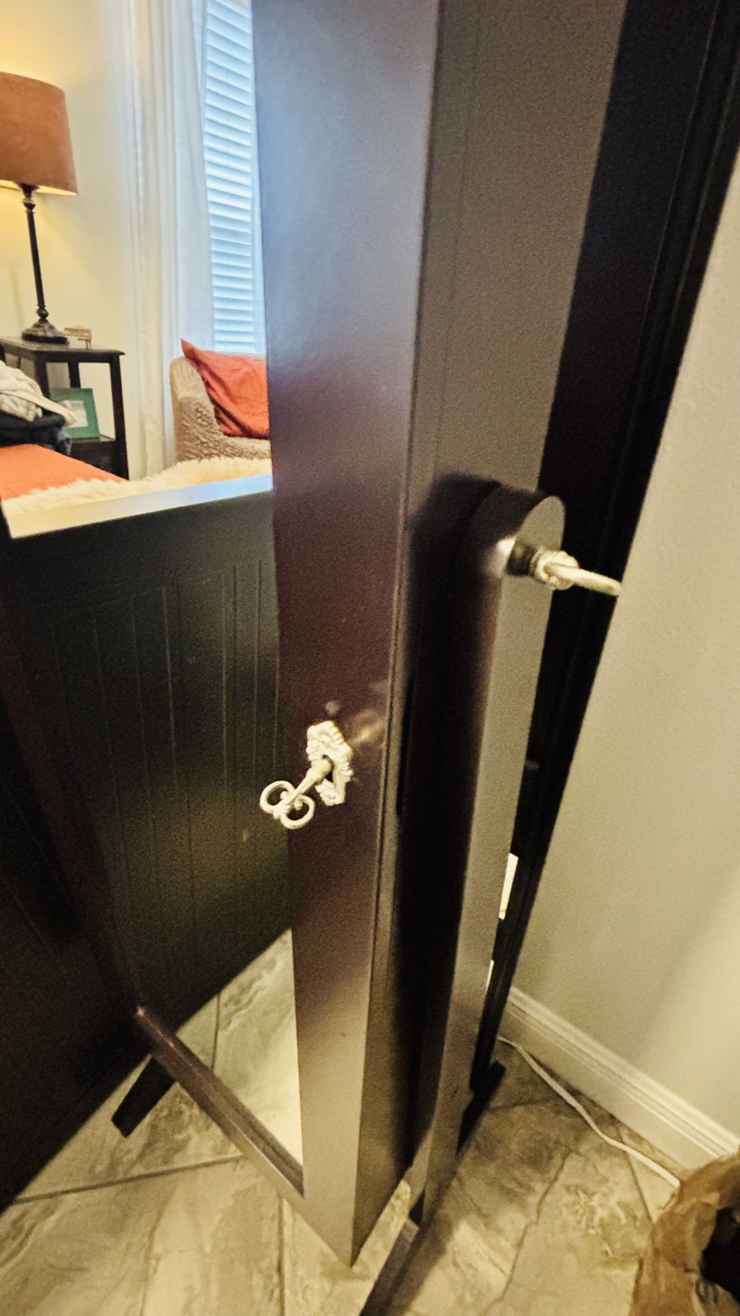 Beautiful jewelry cabinet, inside mirror cracked. And has a lock that works