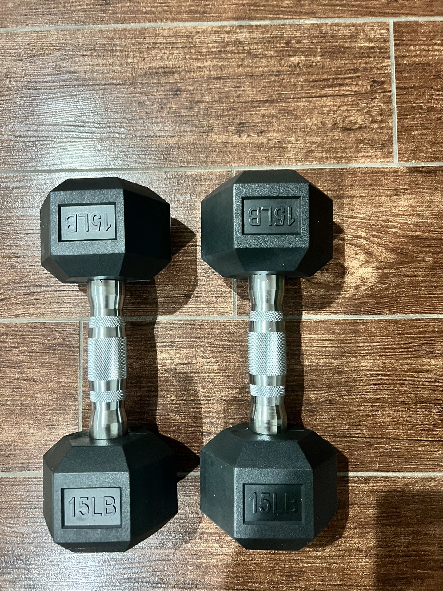Contoured ergonomic handles knurled textured grip Rubber hex design for stability. I have these sets 2 x 10 $28 2 x 15 $38 2 x 20 $48 2 x 25 $58 2 x 30 $68 2 x 35 $78 2 x 45 $98 2 x 50 $108 ***sold in pairs and price is firm