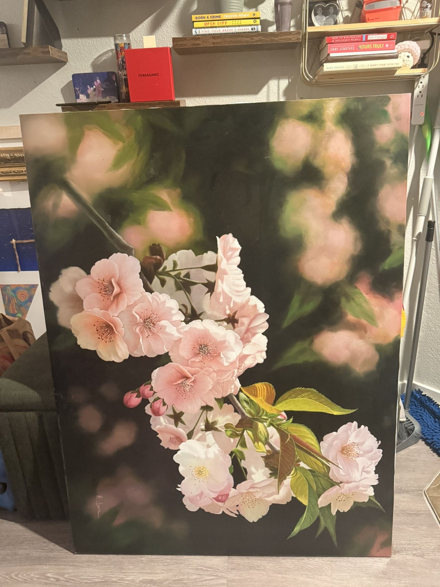 Beautiful large hand-painted oil painting of cherry blossom flowers. Signed by the studio artist. High-detail flowers with a soft blurred background. Real hand-painted oil on canvas—NOT a print. Canvas only, no frame, but ready for hanging or framing. No certificate included, but it’s authentic Timeless Treasures studio work. Great for living rooms, bedrooms, offices, or modern décor. Price: $220 OBO
