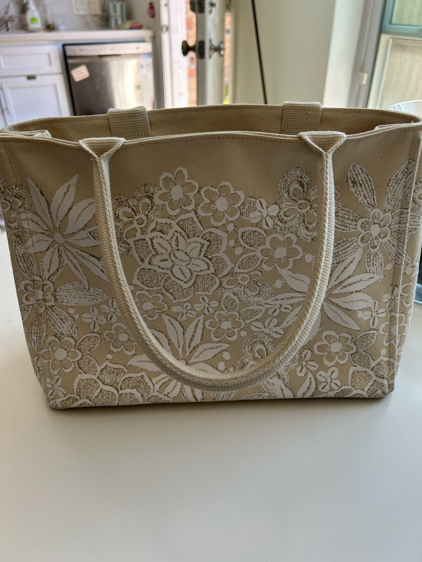 From the collab Target did with Neiman Marcus holiday collection 2012. Super comfy canvas off-white/beige tote with floral design imprinted. Silver hardware, feet on bottom, all zippers work. Inside you have plenty of pockets with an audio pocket & inner pockets. Both sides have snaps that allow you to undo or leave closed. Strap drop is 7inches. Great winter bag!