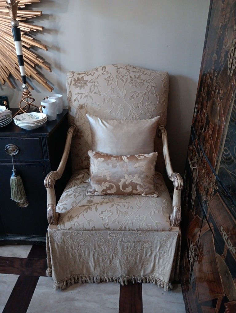 TWO Custom made vintage chairs upholstered in premium fabric with gorgeous trim. You must have a truck to pick up or a large SUV. All pillows included. Asking $200 x2.