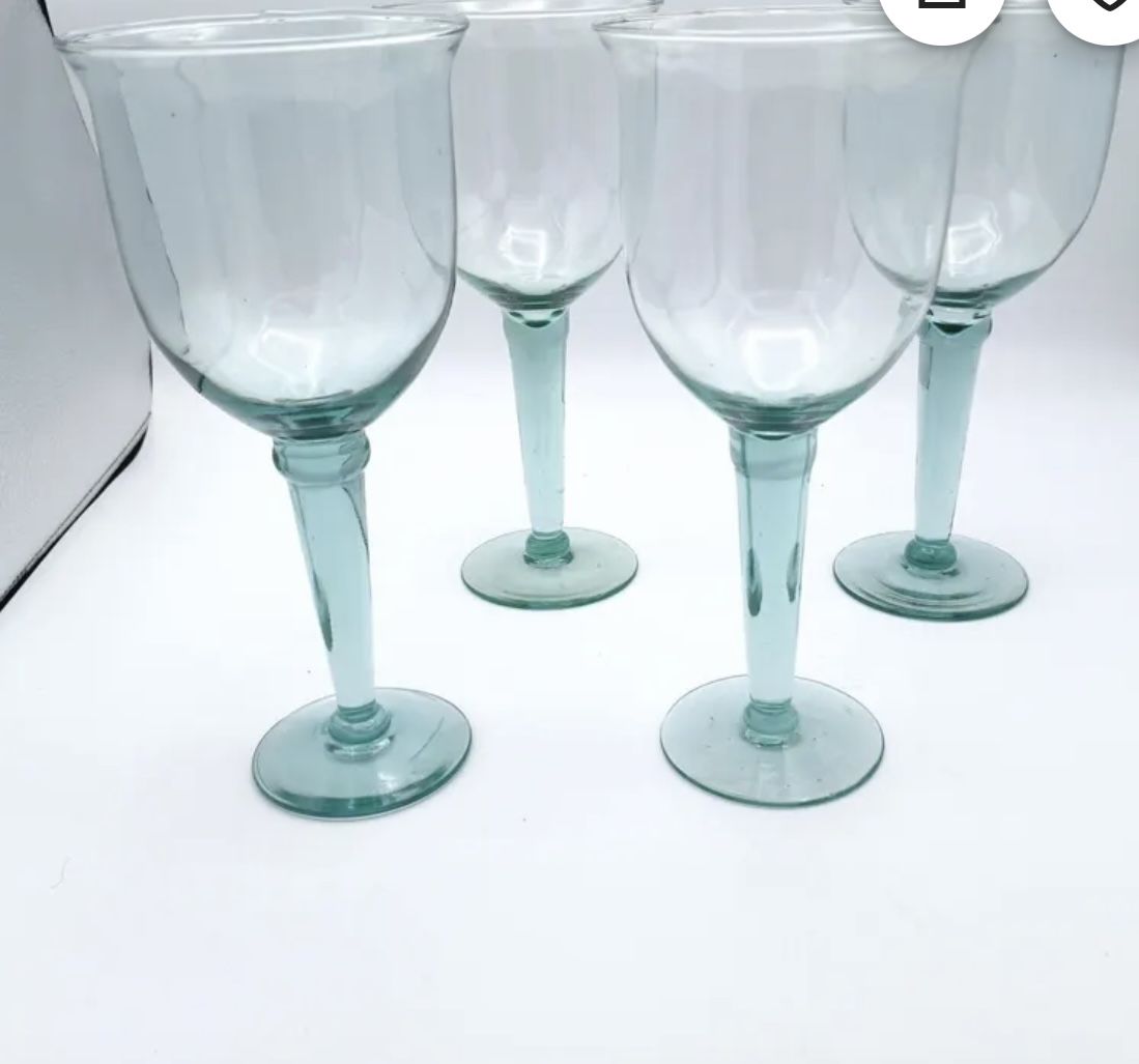 La Mediterranea green recycled glass goblet, which can be used for wine or water. • • Origin: These glasses are handmade in Spain from 100% recycled glass $25 each or discount the more you buy