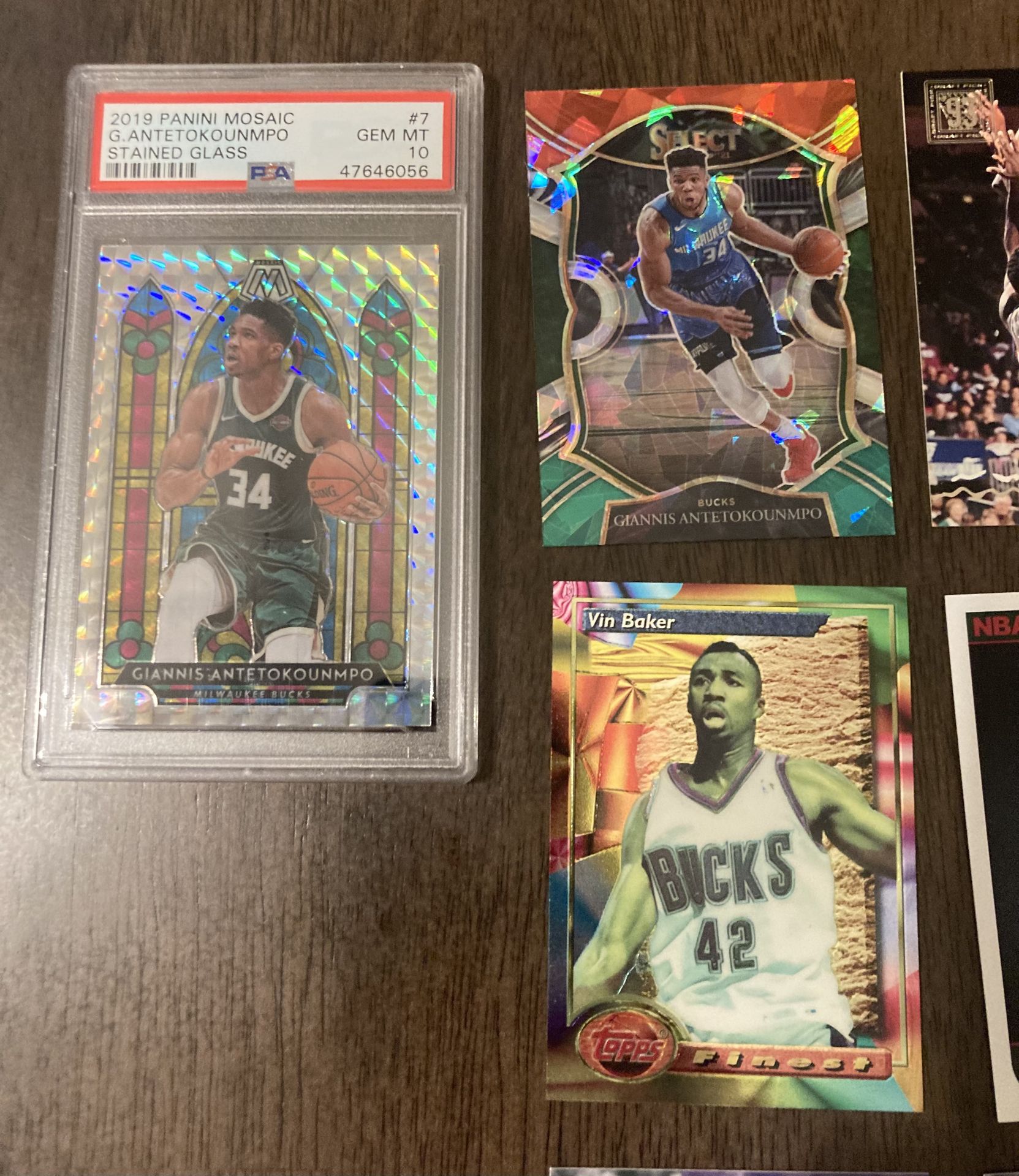 Lot Of 60 Milwaukee Bucks Cards. The highlight of this lot is a Giannis Antetokounmpo 2019 Panini Mosaic Stained Glass PSA 10