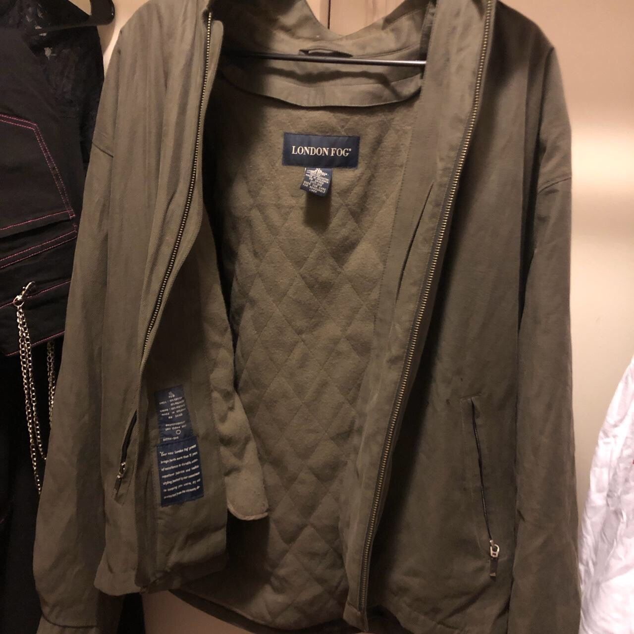 London Fog 2n1 Coat Vest Jacket Olive Green Grey 2 pockets outside, another pocket inside, buttons on bottom and sleeves, zips off inside into a vest.