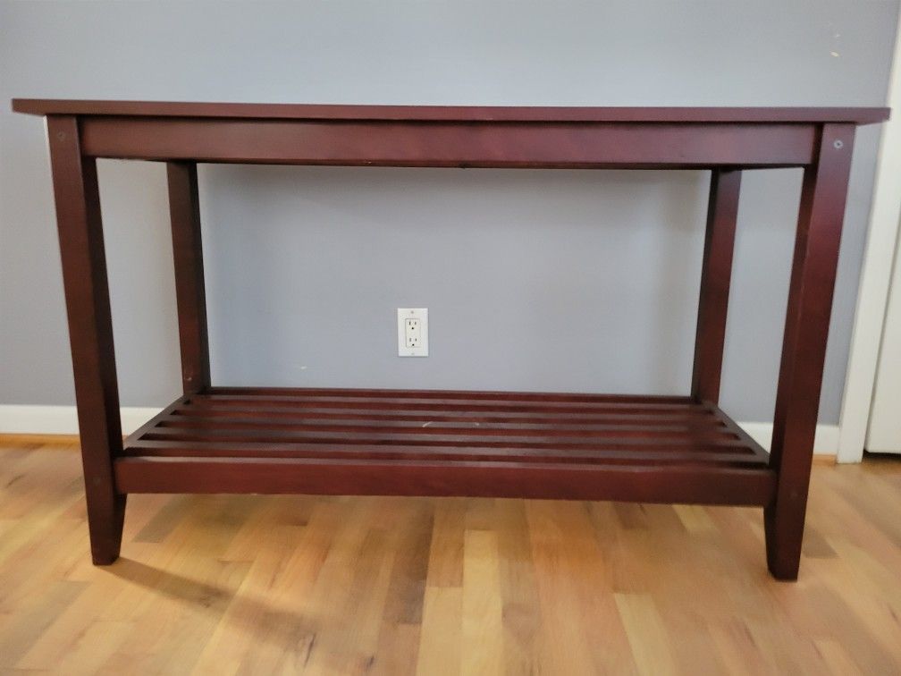 Sofa console table cherrywood glass inset 47“ long, 18" deep 88 1/4“ inches tall, some scuffing overall and chipping to finish inside of glass inset. Slats on bottom of table have a lot of give and do not seem like they would hold very heavy weight