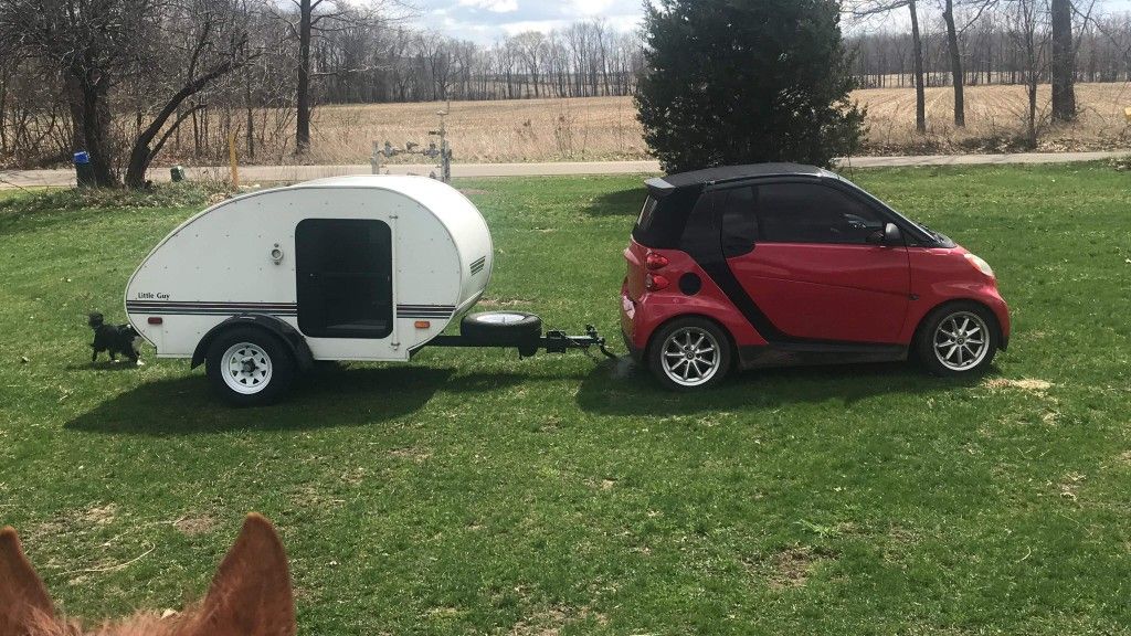 2009 convertible Smart Fortwo with a Little Guy camper. Has hitch for towing. New tires. Clear coat is peeling off. The Fog lights are installed, need programming to work. Motor has 60,000 miles. Body and transmission have 160,000. The transmission flywheel, pressure plate and clutch assembly were replaced when motor was replaced. Runs great. Choose Automatic or manual. The convertible top can be opened and closed while driving! The top has been sticking, we have had to help it close . Camper has spot on seam that leaked during hard rain. No leaks anymore. Has been caulked. Has some water damage. Needs a little TLC. A full size mattress fits perfectly. Has hook up for electric shore power. Great tires and a spare. It has doors on both sides with screens and two umbrella holders on both sides. Camper weighs 660#. Asking $7,000 OBO for Smarty with Little Guy camper. "Smarty Guy". Have clean titles for Smart Car and Little Guy camper. Make an offer. For sale again this summer June 3, 2023