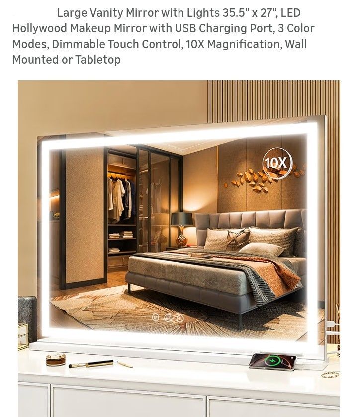 NEW IN BOX LARGE VANITY MIRROR WITH LIGHT 35.5" x 27" LED WITH USB CHARGING PORT 3 COLOR MODE DIMMABLE TOUCH CONTROL WALL MOUNTED OR TABLE TOP