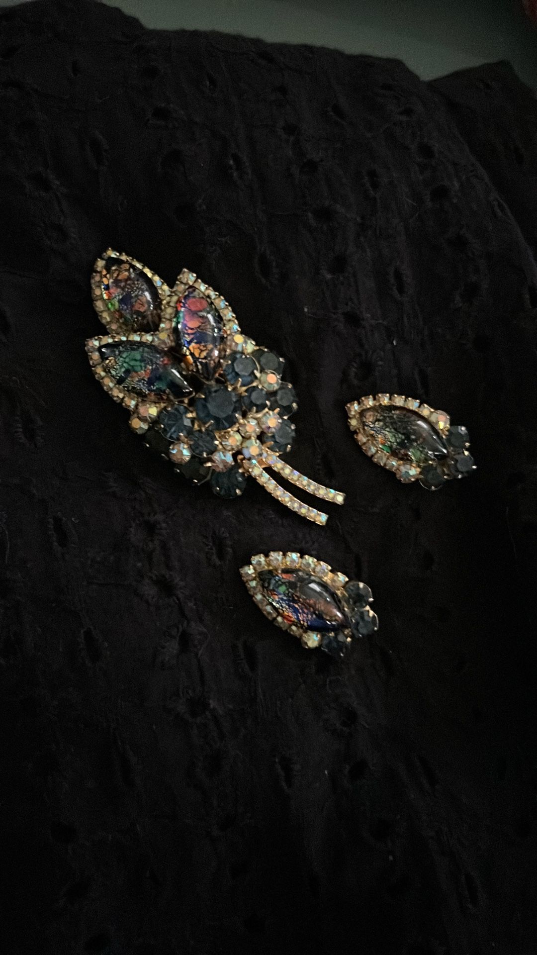Antique multicolor foil, glass and rhinestone brooch and earring set