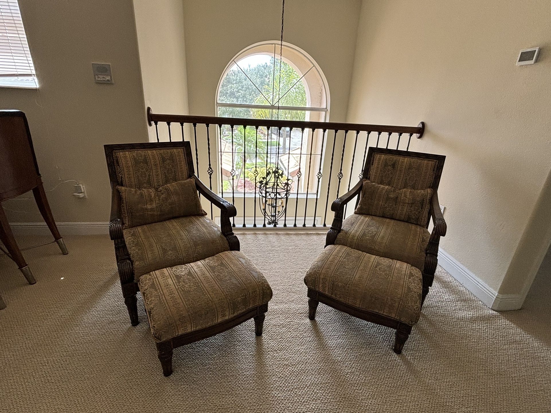 Elegant upholstered armchairs with matching ottomans. Perfect for any living space. $400 or best offer. Priced to see fast.
