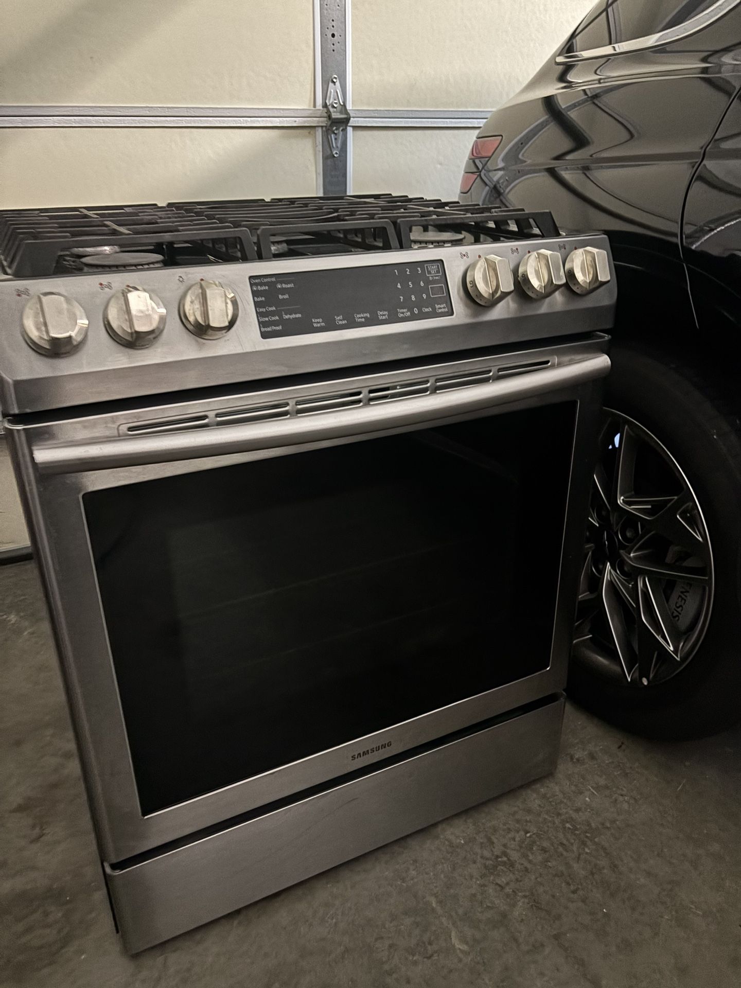 Samsung Gas Slide-In Range Model# NX58M9420SS/AA Stainless Steel, 5 years old, in good condition. All burners and oven are in good working order. There are 5 surface burners and caps, 3 surface burner grates, 2 wire racks, 1 filler kit and screws, storage drawer, convection fan, Broil oven burner, touch display and removable oven door. There are a few imperfections at the base of the oven and the knob which turns the oven light on and off, needs to be replaced. Feel free to message me with product questions.
