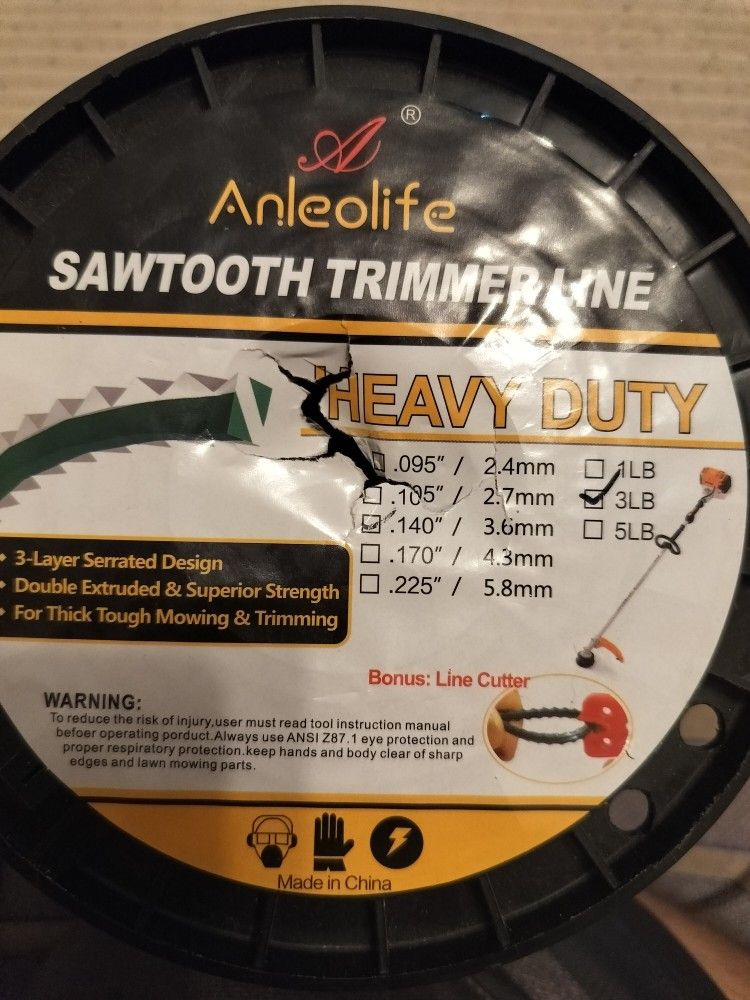 I'm selling this Anleolife sawtooth trimmer line for $10 dollars it's brand new I have no use for it and my weeder spoil is too small for it so I am selling it if anyone is interested message me back first come first serve CASH ONLY MUST GO NEED GONE ASAP FIRST COME FIRST SERVE. Must have a big enough weeder spoil to fit this line it's very heavy duty and very sharp My asking price is $10