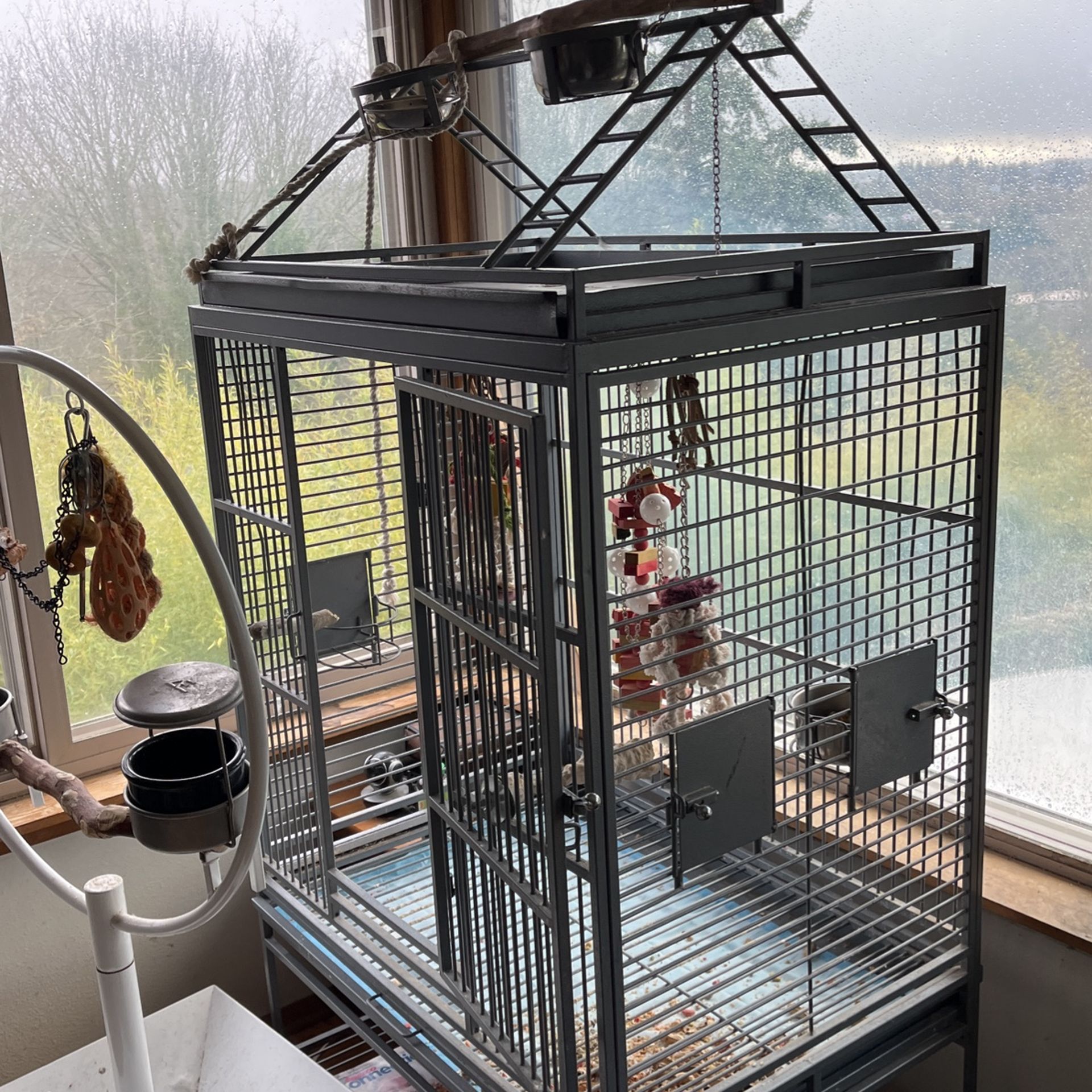 Very very big cage, only used by 1 bird, toys cost a little extra. Has wheels so very easy to move around. Will come with feeding bowls (2)