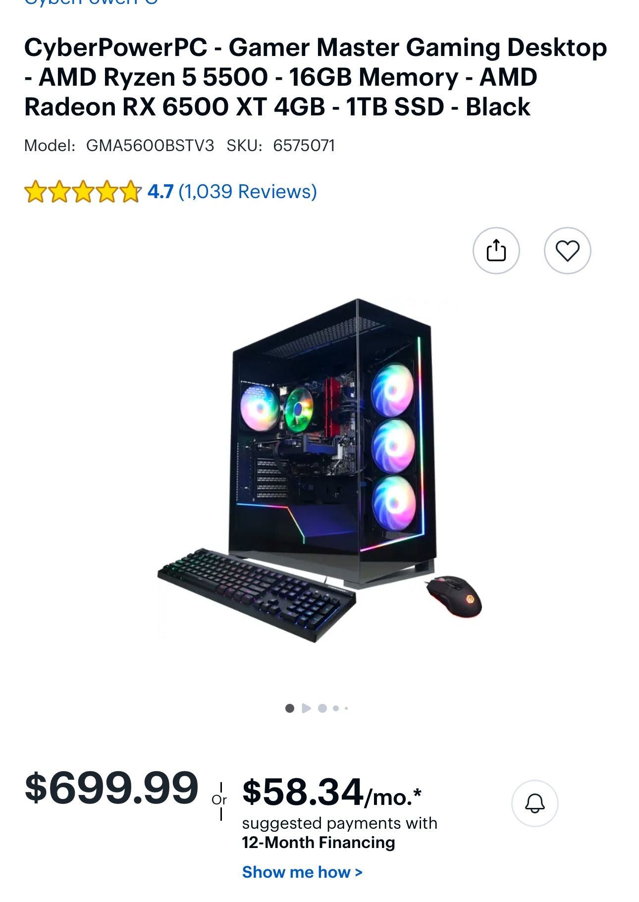 Cyberpower gaming PC only a month old. This PC is barely used and still has plastic on it. I still have receipt for it. I just dont have time for it anymore. IT DOES NOT COME WITH THE KEYBOARD, MOUSE ONLY. My loss is your gain. Will show it works perfect for serious inquiries.