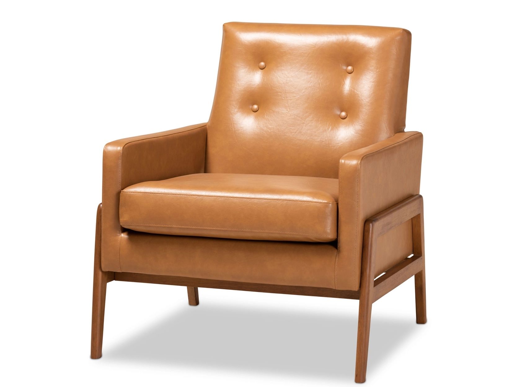 Constructed from rubberwood and engineered wood Walnut brown finish Upholstered in faux leather and padded with foam Button tufted