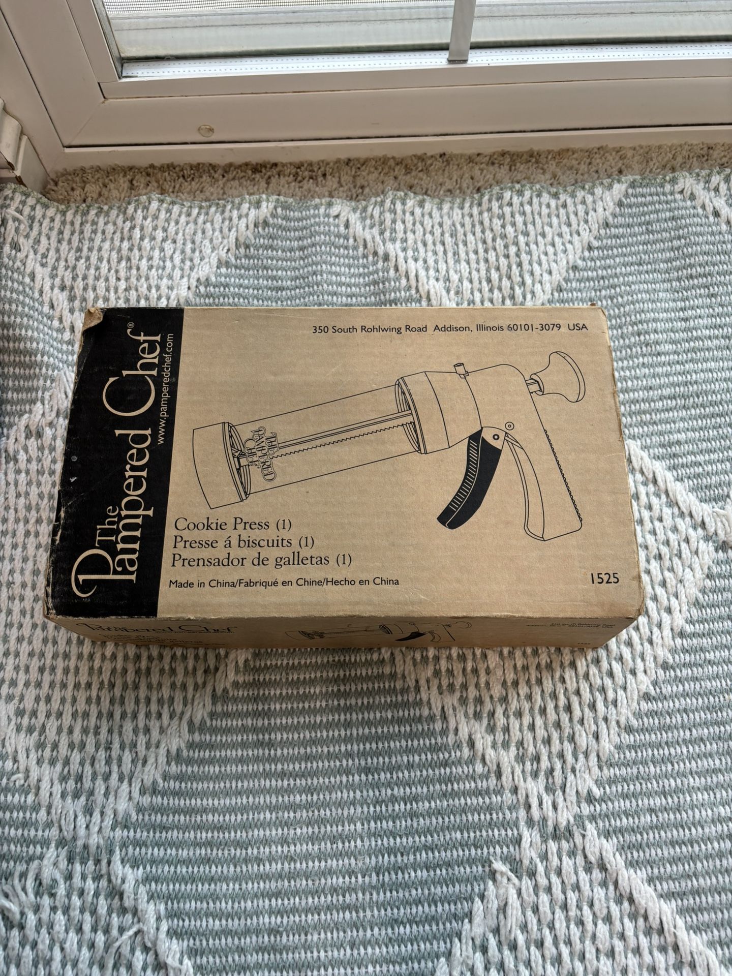 Pampered Chef Cookie Press with 16 different cookie disks. In original box, never used. Comes with original instructions and recipe. Cash only please.