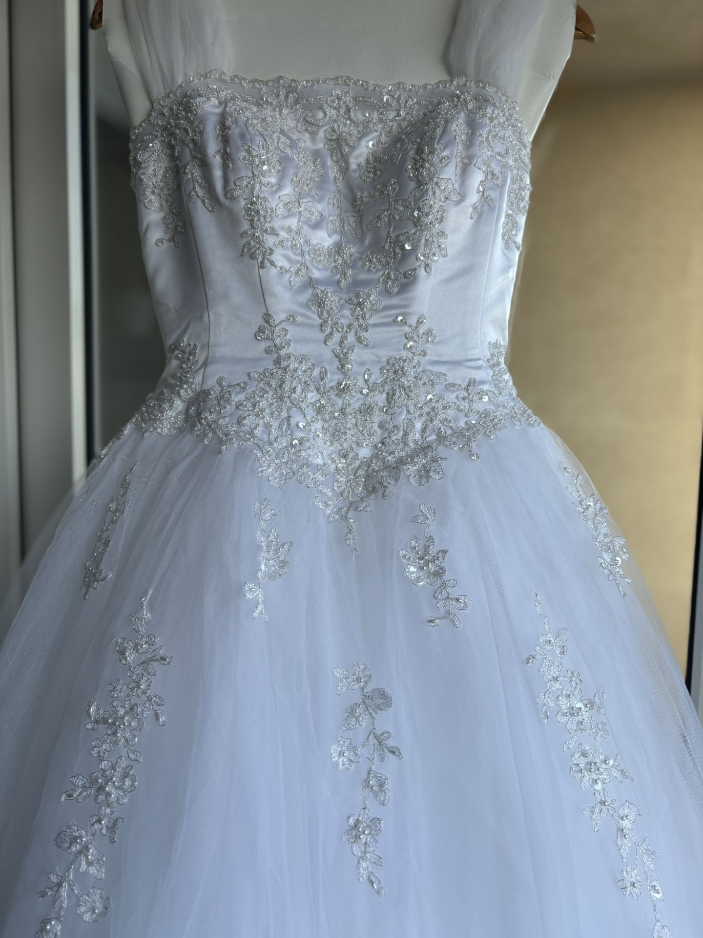 David’s Bridal wedding dress. Size 6. Was purchased for $1500. Cleaned and was stored in a cover. It was a strapless dress but a tulle straps were added, which you can easily remove if you would like. From no smoke, no pet home.
