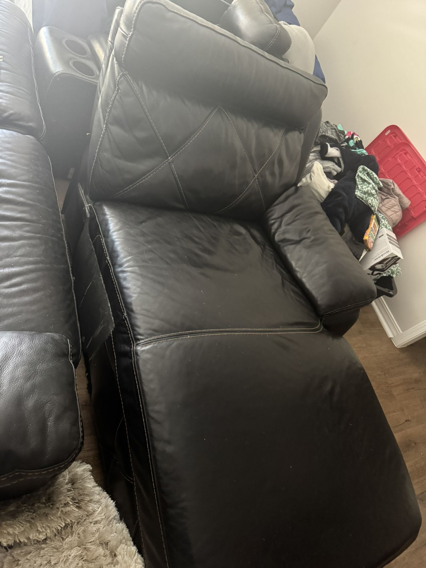 Black sectional Chaise with reclining back rest Electric recliner Manual reclining seat 2 cup holders and storage compartment You can change the lay out of the couch with interchangeable attachments Small tear on back of one seat as seen in picture. Needs some cleaning. Must pick up and open to offers.