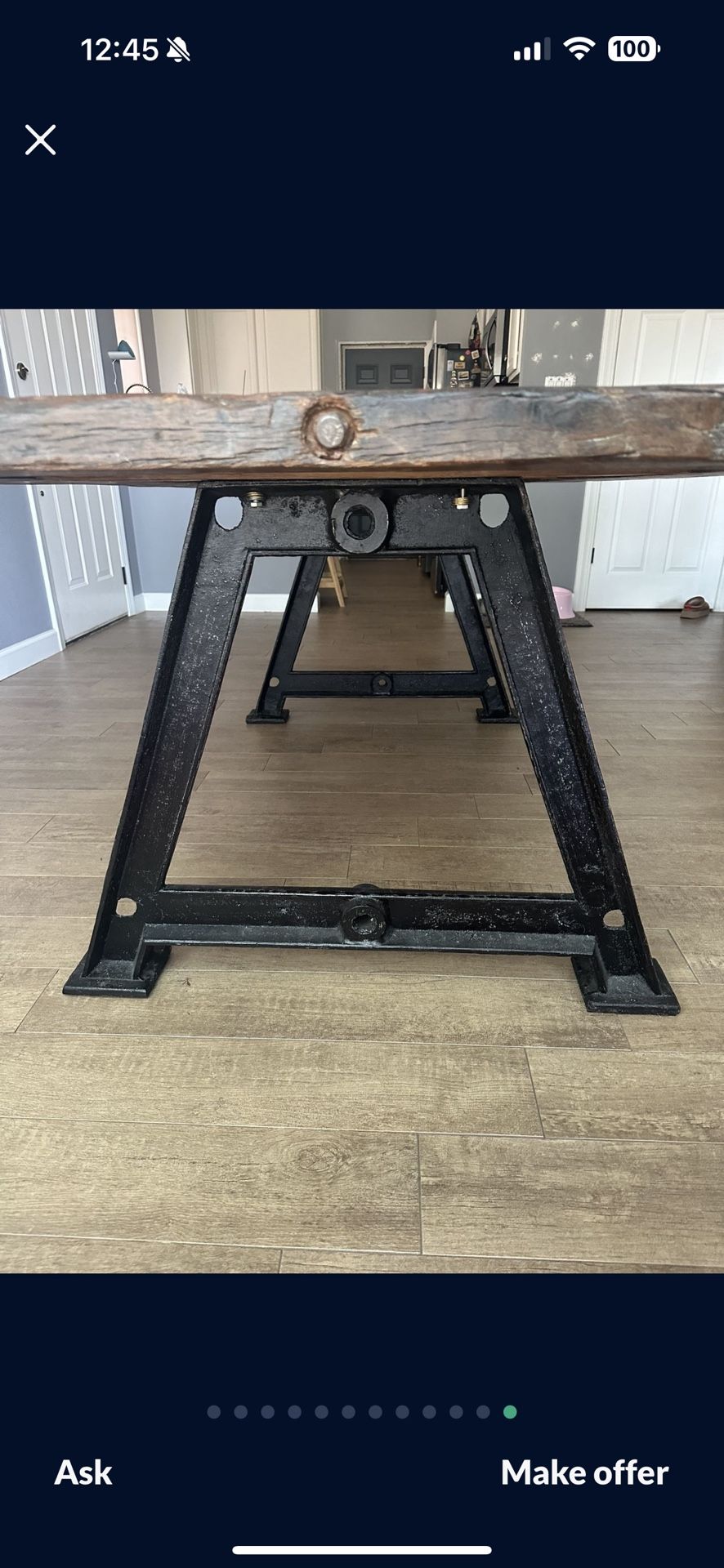The table is located in Austin (Oakhill area) Antique-style solid cast iron legs with a top made of reclaimed railroad ties. The hand cut railroad ties add distinctive charm and character to your home. This table combines beauty and strength. 40”W x 83”L
