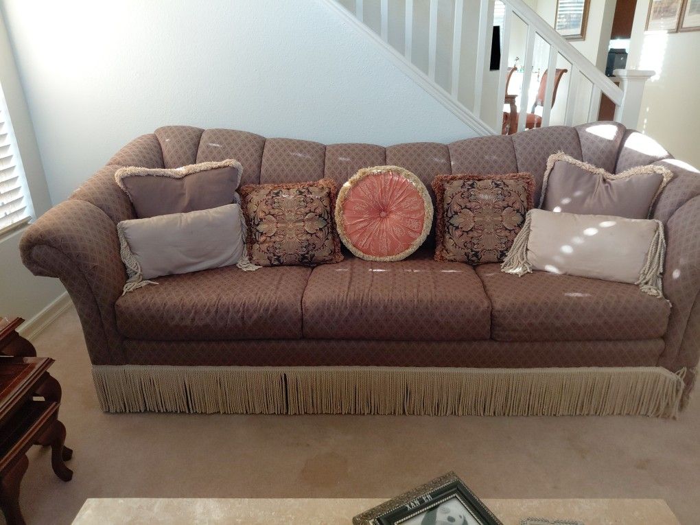 Beautiful Custon made sofa well done with different pillows to enhance the sofa. and mported fabric. 39 inches L × 100 w