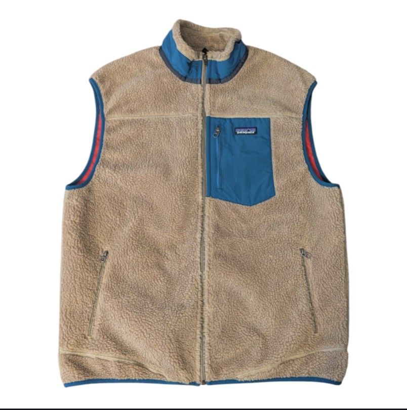 Patagonia Classic Retro-X Tan Blue STY23047FA15 Sherpa Fleece Vest Men's XL DETAILS •Patagonia •Common Threads Partnership •STY23047FA15 •Tan, Blue, Red •Regular Fit •Windproof Membrane Bonded Between 1/4" Pile Sherpa Fleece Exterior & Moisture Wicking, Highly Air Permeable Warp Knit Mesh •Warm Fleece-Lined Stand-Up Collar W NetPlus® 100% Recycled Nylon Mesh Made From Recycled Fishing Nets On Outer Collar & Trim •Front-Zip W Internal Wind Flap •Zippered Chest Pocket, Collar & Wind Flap Made Of 100% Recycled Nylon W .Weather Shedding DWR (Durable Water Repellent) Finish. •2 Zippered Handwarmer Pockets Lined W 100% Recycled Polyester Brushed Mesh •Treated W HeiQ® Fresh Durable Odor Control •Finished Binding On The Collar, Center Front Zipper, Armholes & Hem •Body: 10.3-oz 100% REPREVE® Recycled Polyester ¼"-Pile Fleece Certified By OceanCycle •Lining: 2.2-oz 100% Recycled Polyester Taffeta •Trim: 4-ply, 4.9-oz NetPlus® 100% Recycled Nylon Mesh •Pocket Lining: 5.3-oz 100% Recycled Polyester Brushed Tricot •Made In A Fair Trade Certified Factory •Retail: $179 Approximate Measurements: Armpit-Armpit: 24" Length From Shoulder: 29" Excellent Pre-owned Condition. No Rips, Stains Or Fading. I My Partner Is The Original Owner And He Is Ready To Move Onto Something New. From Smoke Free Household. Cash And Pickup Only