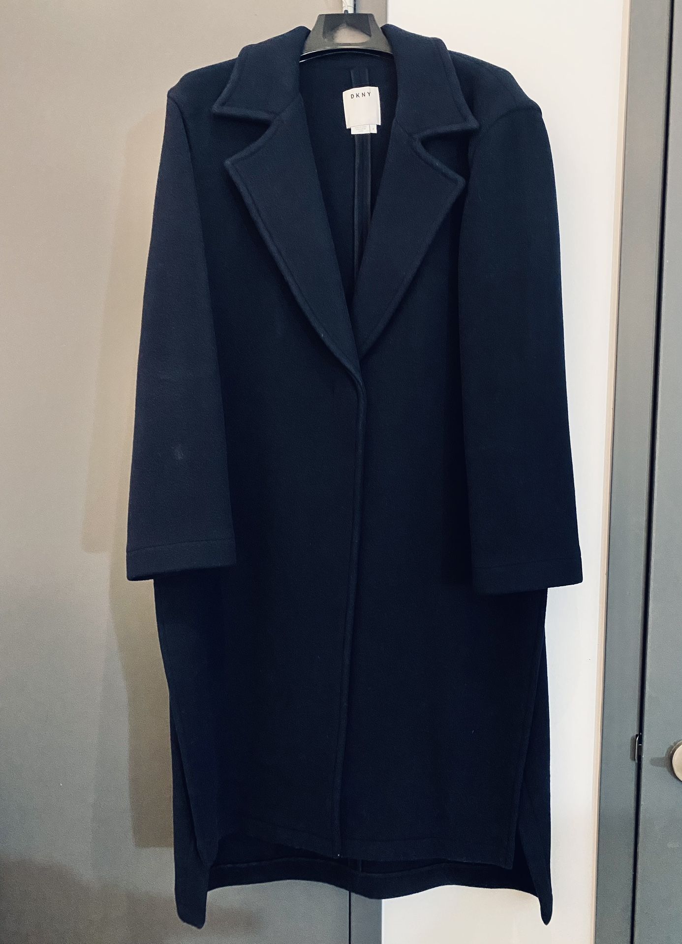 Women's demi-season wool coat of dark blue color without lining Size L with two slits on the sides with one button, fashionable design , in perfect condition, worn twice Pickup and cash only