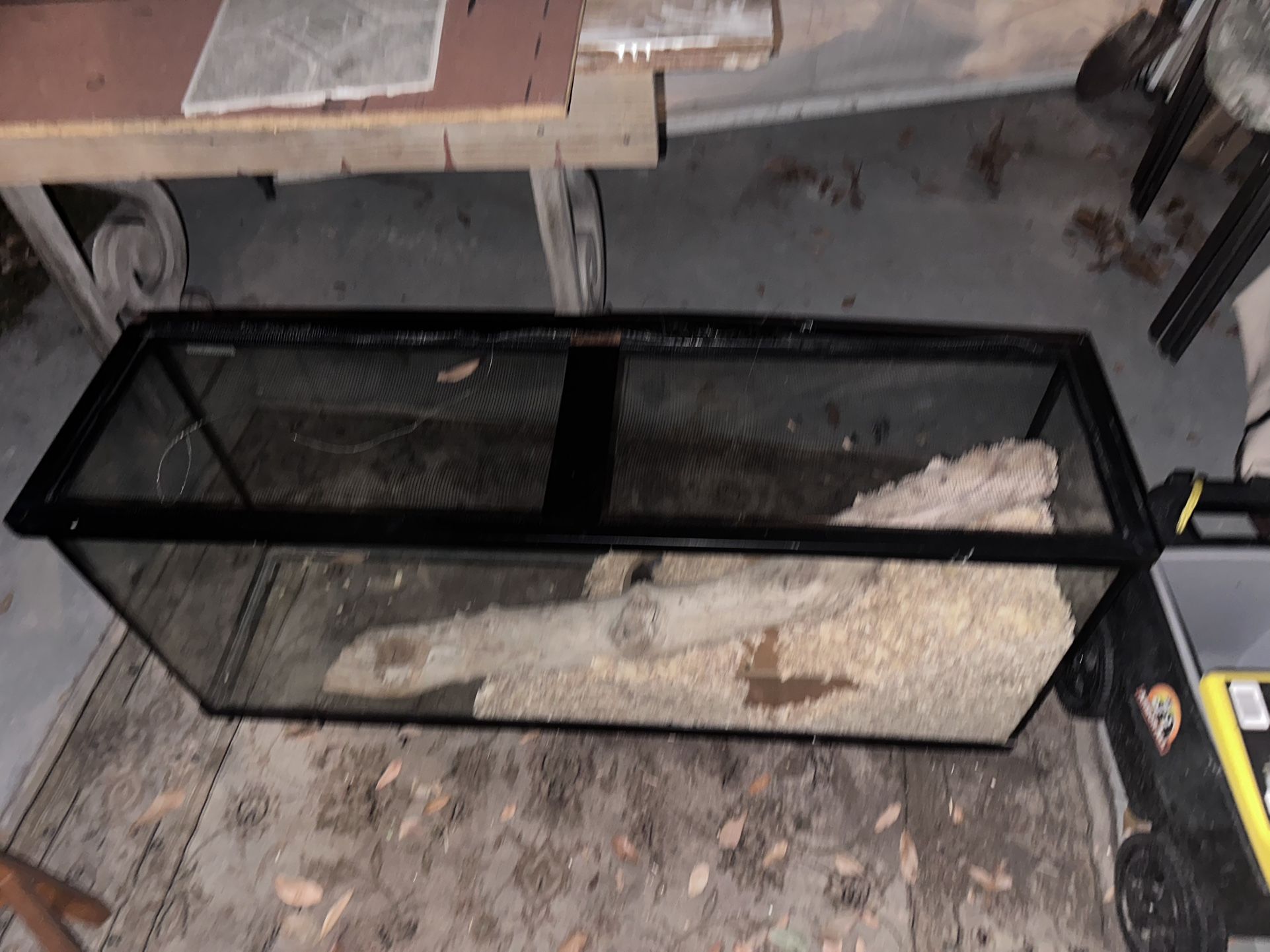55 gallon glass reptile tank with black frame and screen mesh top. Includes natural wood/log décor, substrate, and hide areas already inside. Good condition and ready to use. Screen top has normal wear. Great for bearded dragons, snakes, geckos, or other reptiles. Heavy glass tank — pickup only, please bring help. $85 cash, priced to sell fast. First come, first served. Message me if interested.