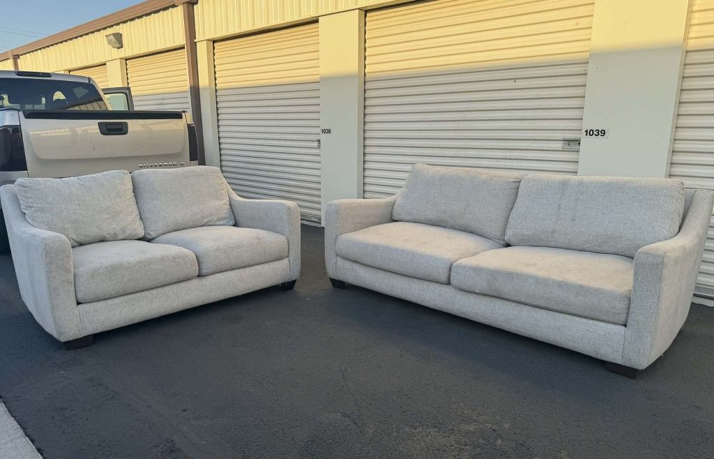 • Light Gray Ashleys Furniture Couch and Loveseat in Good Condition • Small defect under cushion shown in pictures. Does not affect comfort • Dog friendly smoke free home • Needs a cleaning • Both bottom and top cushions are zipper removable • Has no rips or odd smells • Pictures taken outside but kept inside • Measurements in Inches: - Couch 90" - Loveseat 70" - Depth 36" • $240.00. Free Curbside Delivery!