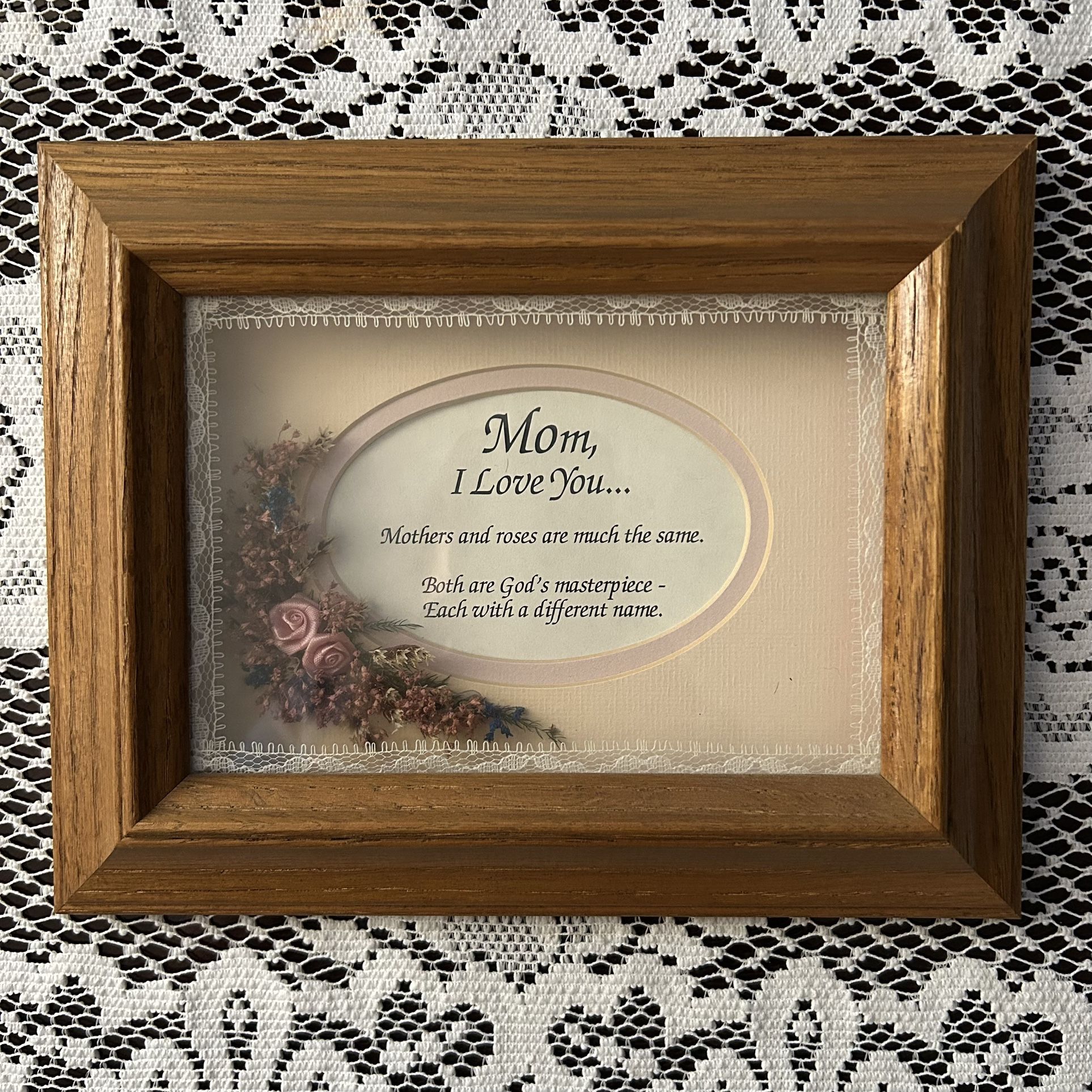 *Use #wrayclark in the search bar to browse my closet using filters! Xposted No Holds. Please read item description. Local pick up and shipping available :) GUC! a decorative classic designed oak wood framed print or shadow box with a sentimental message for a mother. The central message reads, "Mom, I Love You...". It features a poem comparing mothers and roses as "God's masterpiece". The design includes dried floral embellishments and a lace trim around the central message. Approximate measurements 9.5”x7.5”. Clean smoke free home. 1+lbs Vintage Mom mother birthday mother’s day appreciation shadowbox plaque picture framed art grandmother floral flower cottage cottagecore grandmacore