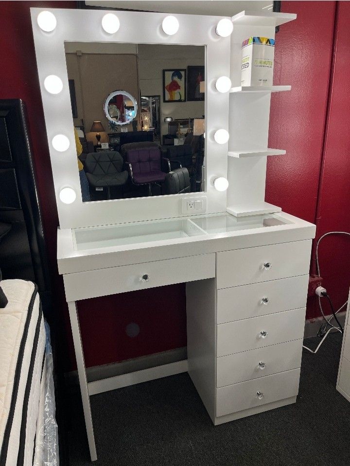 White Vanity w/Lights and Drawers and 1 Shelf (Included a Free Stool White or Black 👍90 days FREE FINANCING ❗NO CREDIT CHECK❗