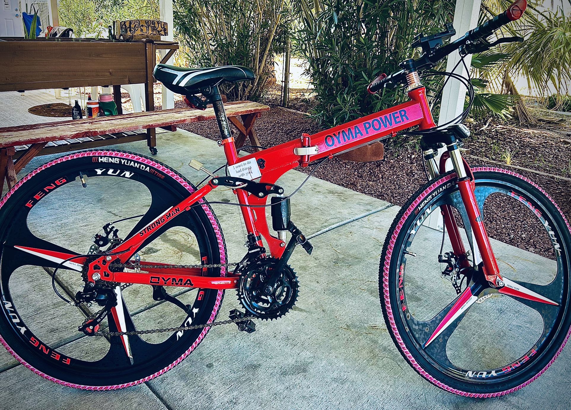 RED OYMA Power Foldable Mountain Bike: need handlebars put back on. Looking to trade for an E-bike, Foldable Bike, larger Mountain/Road/Trail or Hybrid Bike I DONT know how to fix bikes which is why I’m moving past it..Beautiful Fast/ great and reliable. 280$ or Trade I was going to switch the handle bar but didn’t get around to it. I have the handle bar still, you can hv them and put the back on. Also add red night riding lights as accent