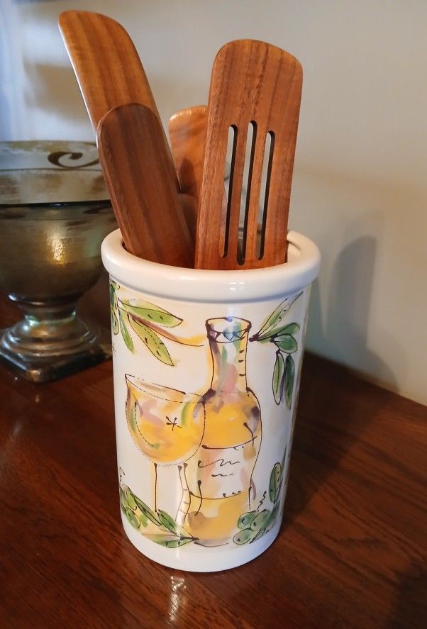 Ceramic. No chips. I used for cooking spoons. Wine decor.