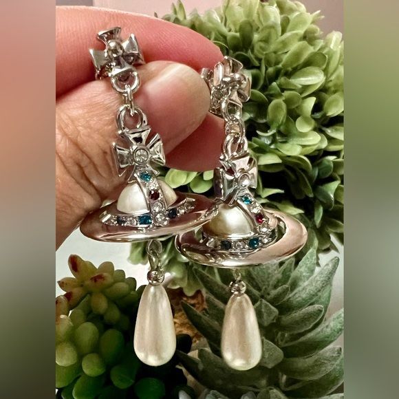During the late 1980s, Vivienne Westwood introduced her renowned pearl concept as a solitary strand, showcased in the Harris Tweed Fall 1987 fashion show. The shape of our Pearl Drop earrings recalls the shape of Vivienne's initial creation, displaying a three-dimensional orb motif enhanced with crystal embellishments and a suspended teardrop, baroque pearl detail. Features silver-tone plating Polished finish Post-back closure Weight: 17.77g Earring drop: 5.5cm Orb height 2.5cm, width 2.5cm