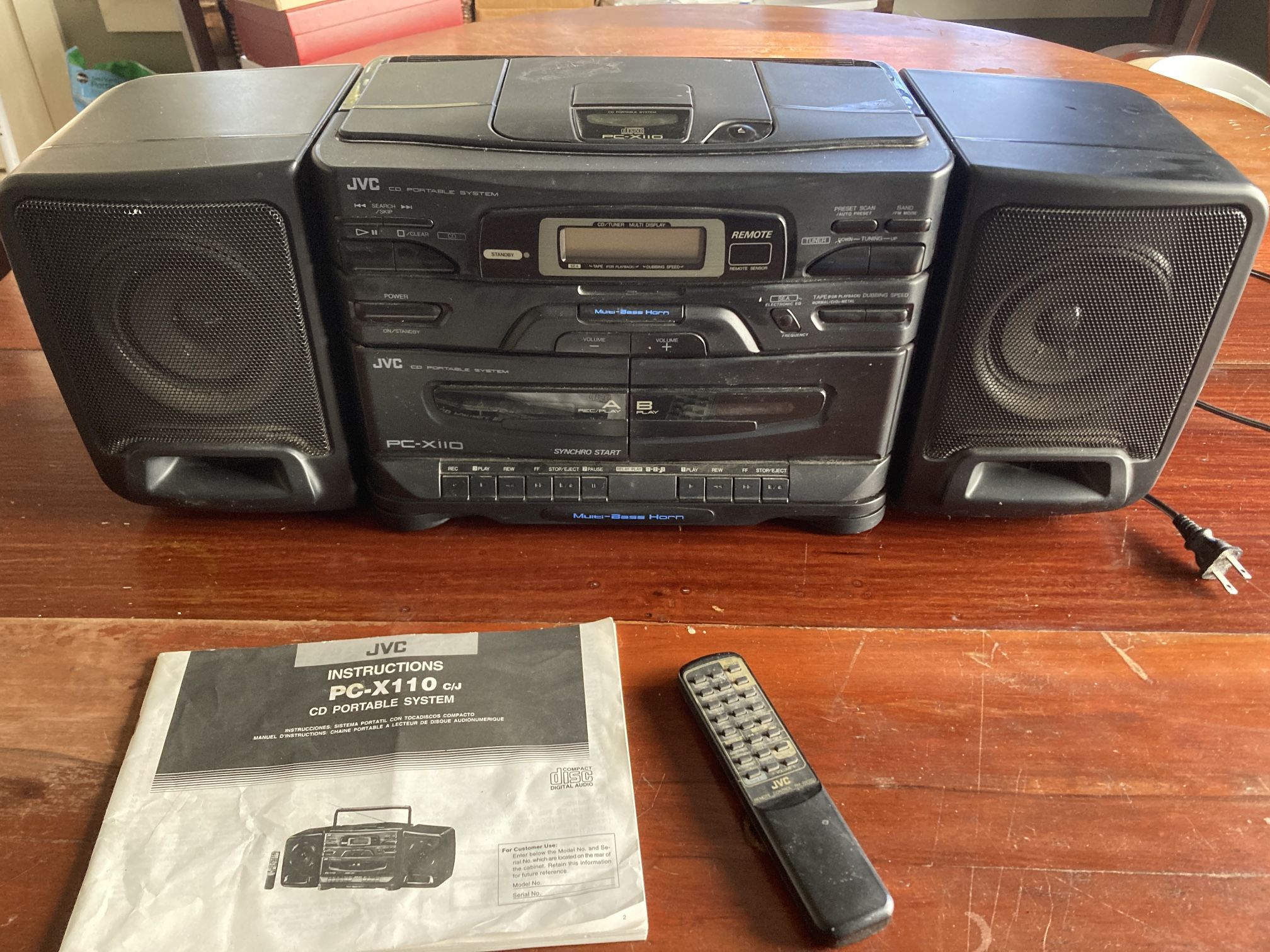JVC PC-X110 CD/Radio/Dual Cassette boombox w/ detachable speakers, purchased in 1995. Comes w/ power cord, remote control, and manual. Looks, works, and sounds great, with these exceptions: --Tape deck A (rec/play) isn't working properly: muffled sound, may need a head cleaning or repair. --Corrosion on some of the battery terminals, should still work fine w/ batteries. --Spot on top of the CD player with residue from some spilled adhesive.
