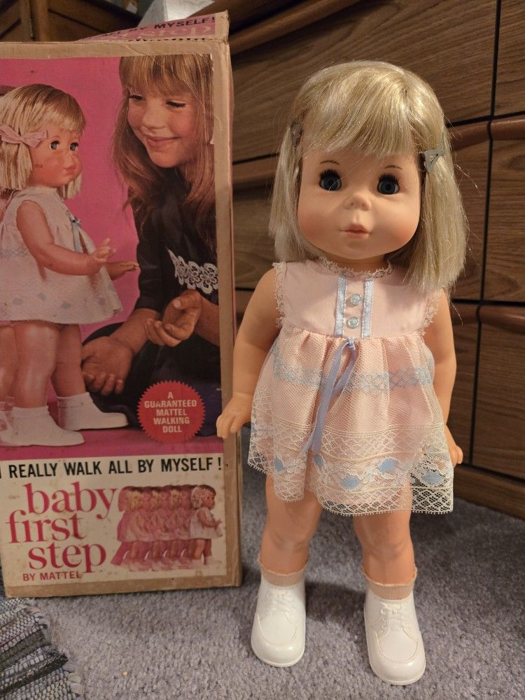 Vintage 1964 Mattel Baby First Step, with original papers and box 18” hard plastic/vinyl doll in fantastic condition. She still works, 2 D cell batteries required (not included). Her hair clips are different from the picture on the box. This doll was gently used and very well cared for, still with original box. Box is showing obvious signs of age, but still in tact. This doll will make a great addition to any collector, or a special gift for a you g child. Cash only. Local pickup only *Please Note* I will not be available for questions or sales of any kind from December 23rd at noon, until December 28th, after noon.