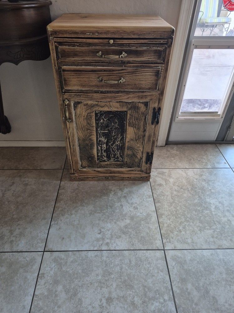 Beautiful rustic cabinet 2 pull out drawers and a slide out desk and a bottom cabinet with a religious type of shepherd with a bible.. 40.00