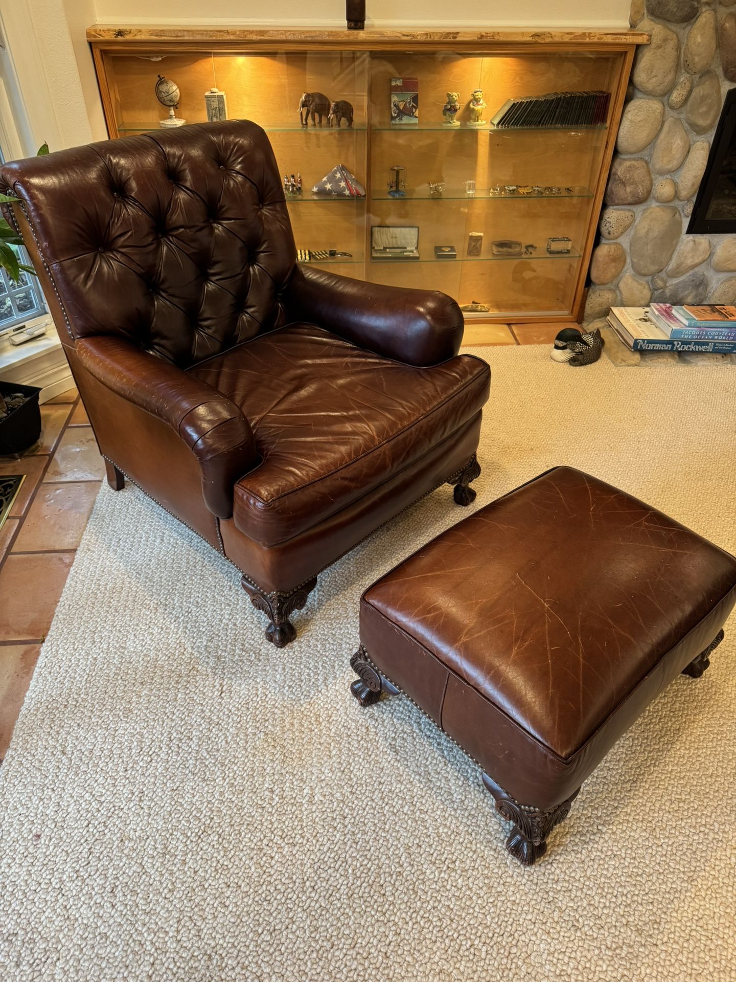 Leather chair and ottoman . One arm has minor cat scratches ( see pic) . Nice carved legs and studded trim .