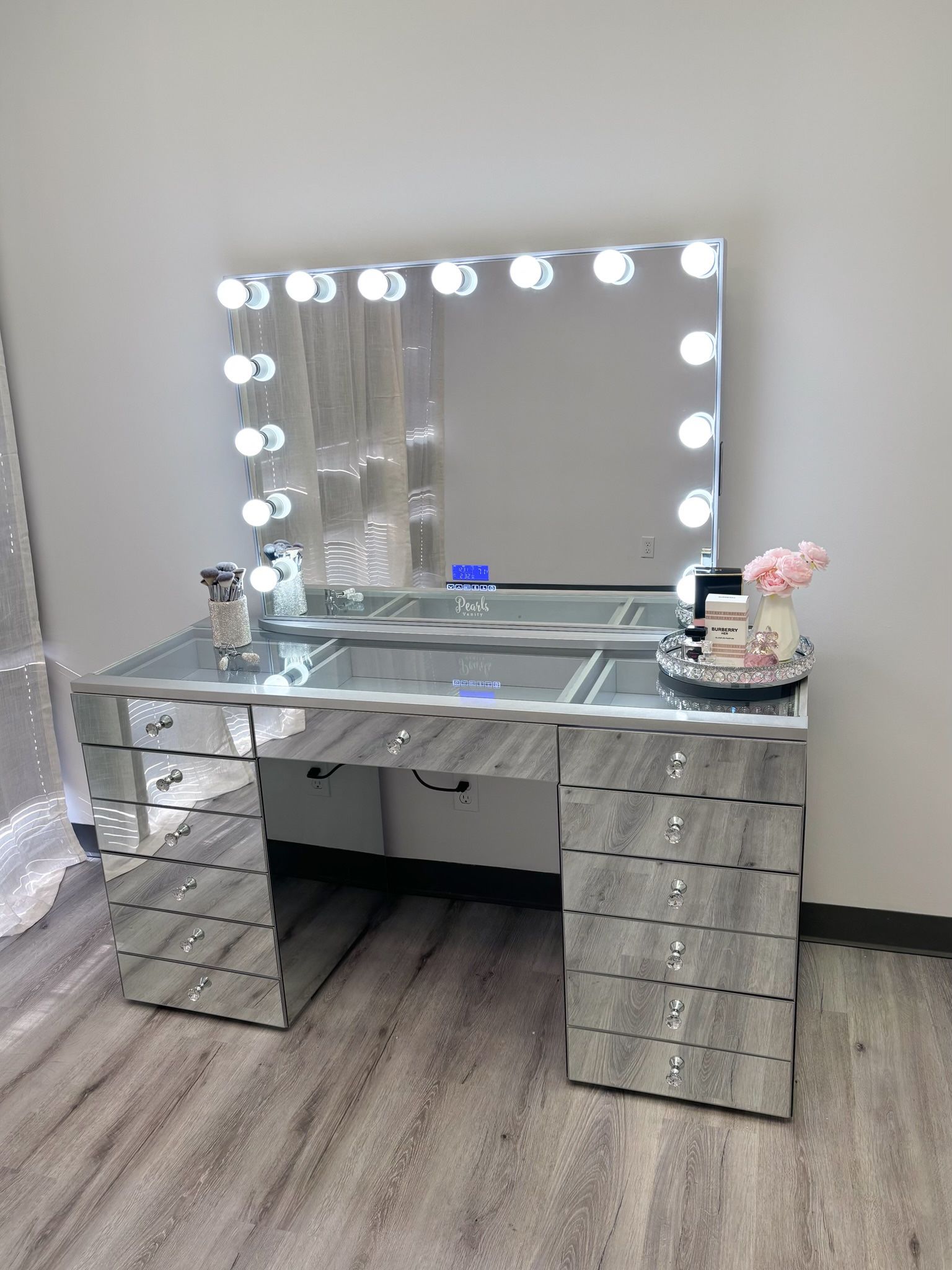 Mirrored Makeup Vanity Bulbs included + integrated speakers, Bluetooth screen, dimming, usb and regular outlets Financing available