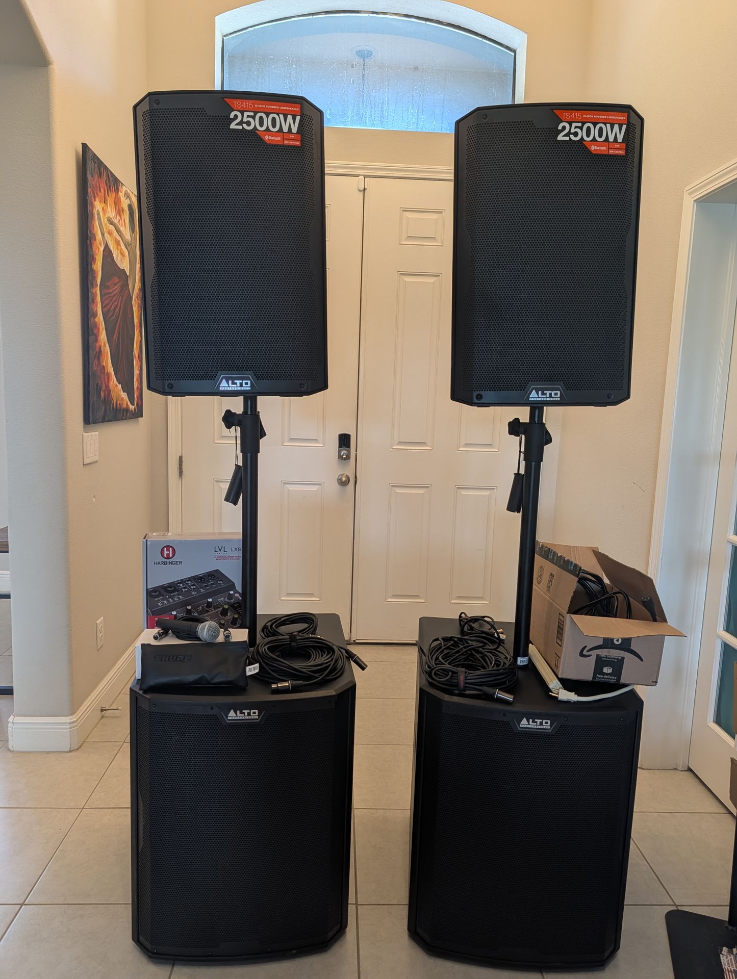 Alto ts415 and TS18s speaker subwoofer system. These are professional grade high output systems designed for large spaces. Selling with harbinger 8 channel mixer, microphone and 2 x 50ft extension cables,. Paid over $ 2600.00 for speakers and accessories. Used a couple of times, only selling because of lack of storage. $2000.00 firm.