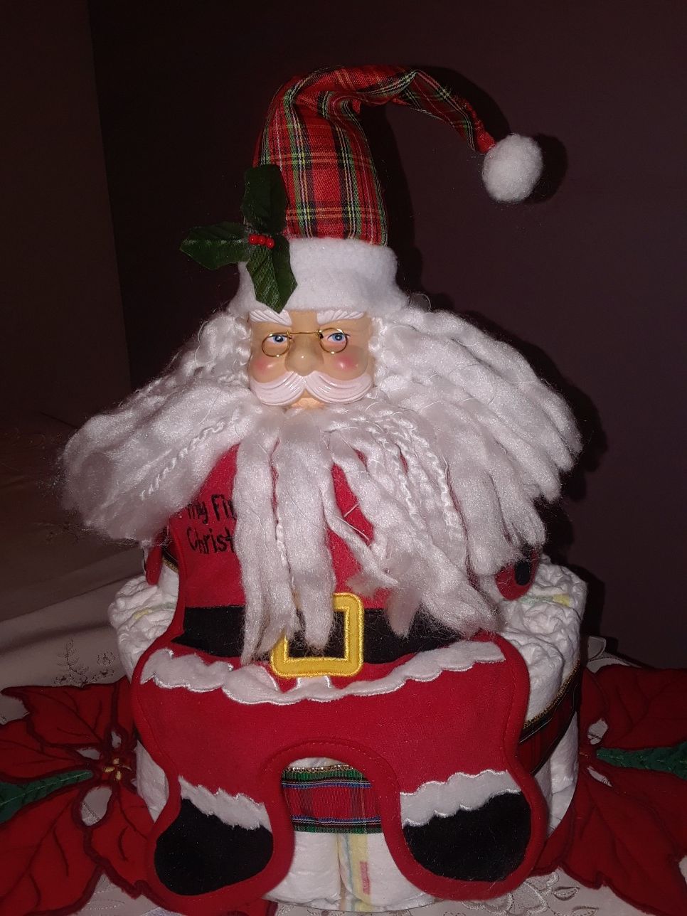 Two tier Christmas diaper cake consisting of 50 Pampers Swaddlers diapers one Santa body bib and one Santa with cap. Cute gift for a baby shower or a Christmas gift. I make custom diaper cakes. If you want something in a different theme I can make it for you. My prices are very reasonable.