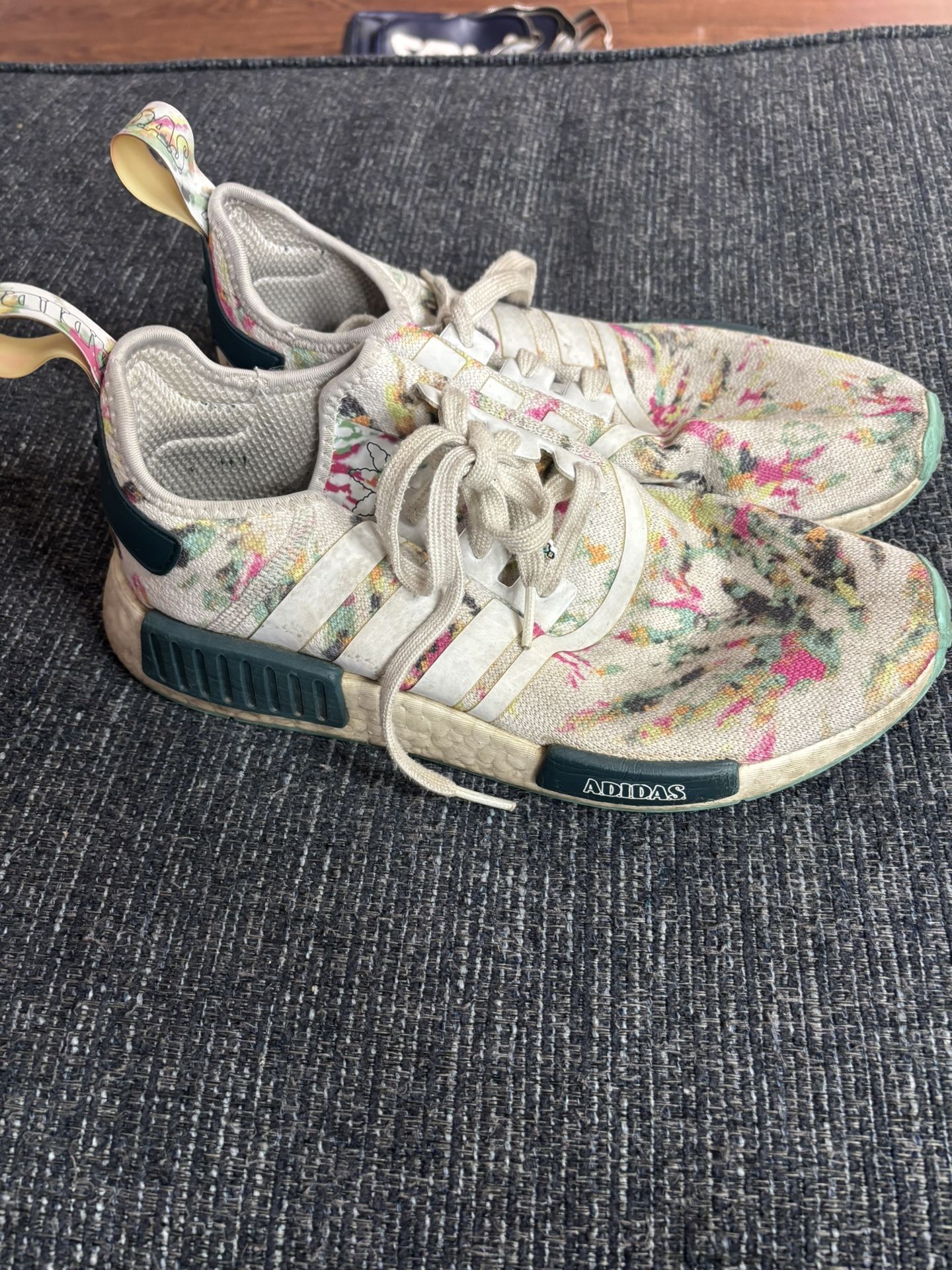Adidas NMD\_R1 sneaker in a cloud white colorway with a floral-patterned knit upper and a teal midsole plug.